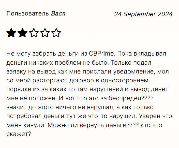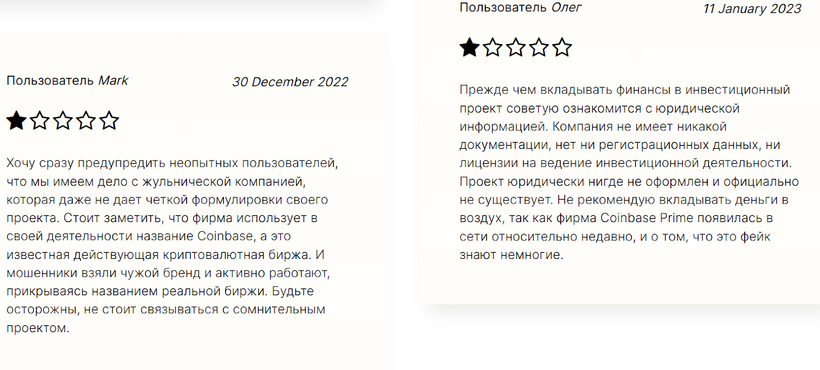 Изучение реальных отзывов о компании Coinbase Prime лишь подтверждает большие риски сотрудничества. Многие пользователи отмечают, что не могут забрать деньги после пополнения счета. Представители компании выдумывают причины, чтобы ничего не возвращать.