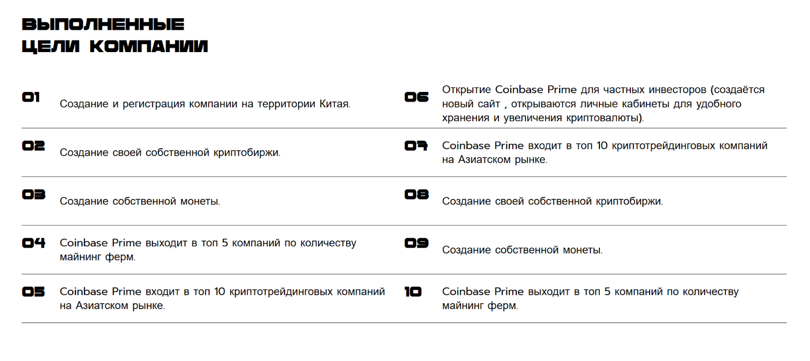 В описании говорится о начале деятельности Коинбейз Прайм с 2012 года. Создатели указывают, что начало положила определенная идея. Правда, какая-либо конкретика в этом отношении отсутствует.