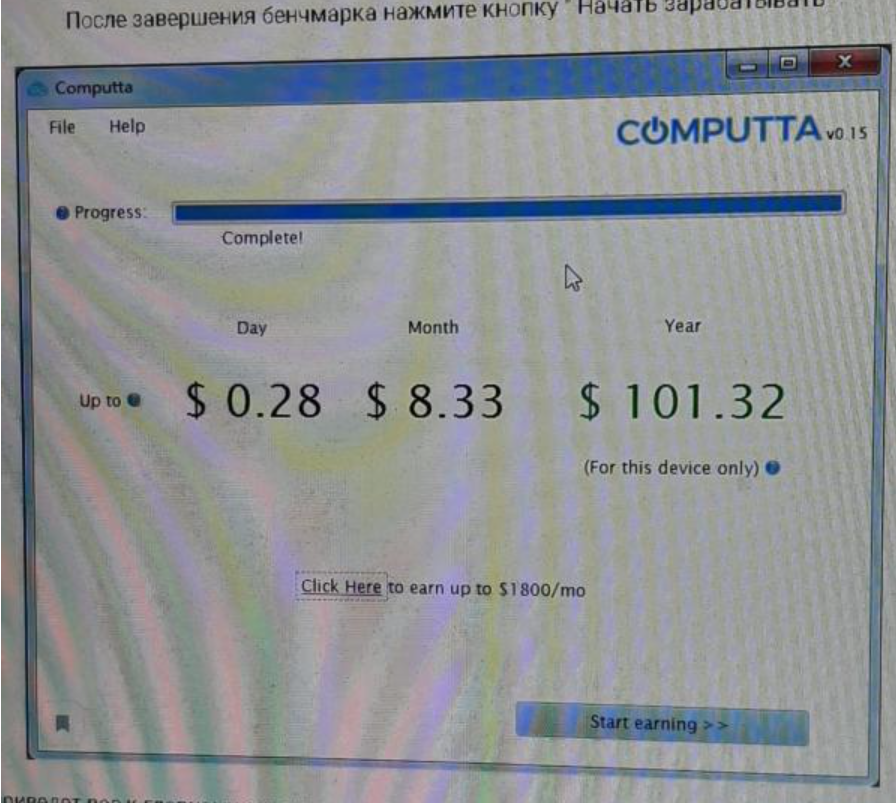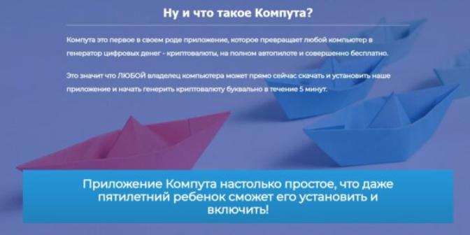 При входе на сайт отображается приветственное сообщение, где говорится, что “Компутта” – это первое приложение, которое превращает любой компьютер в генератор цифровых денег.