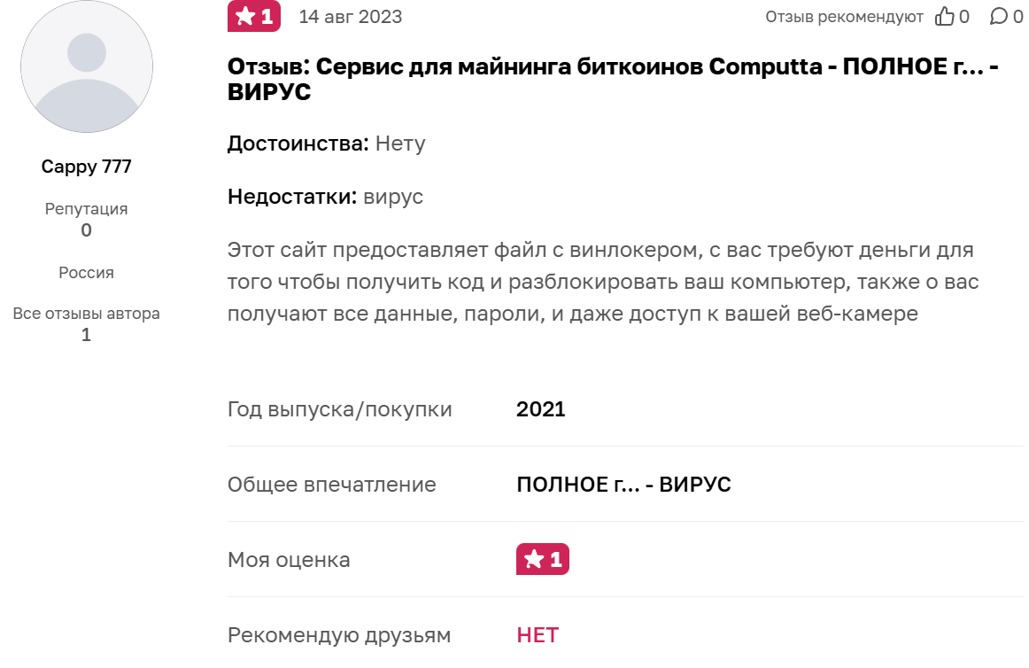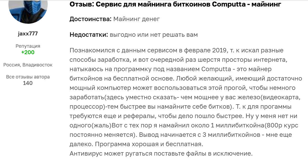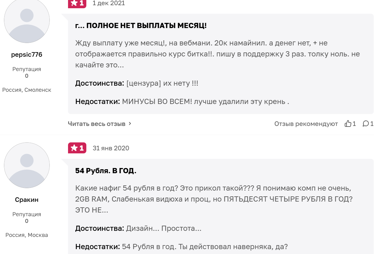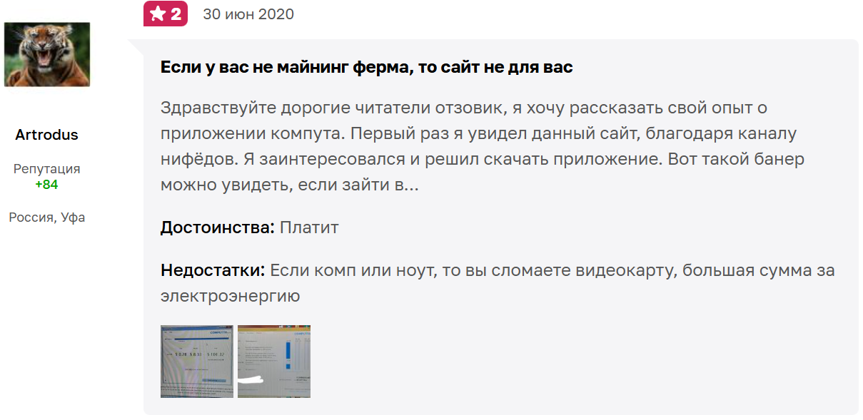 Пользователи пишут, что сервис не выплачивает заработанные деньги. Есть отзыв о computta com, что за целый год майнинга пользователь получил только 54 рубля, что очень похоже на издевательство, так как счета за электроэнергию майнера обычно вырастают в разы.