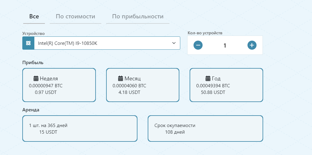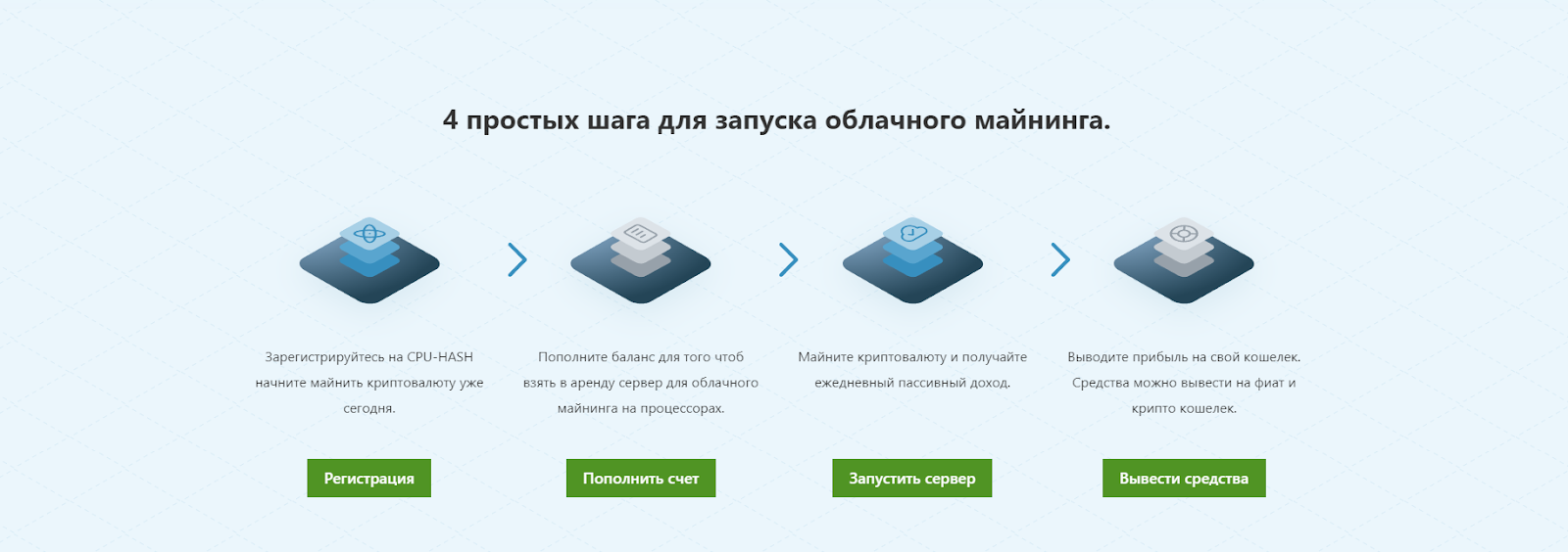 Сама суть пассивного заработка от Цпу Хэш заключается в облачном майнинге на процессорах. Разработчики предлагают арендовать процессор за небольшую сумму, в районе 10-20$ за 365 дней. Однако ваш ежедневный доход составит всего лишь около 15-25 рублей в день.