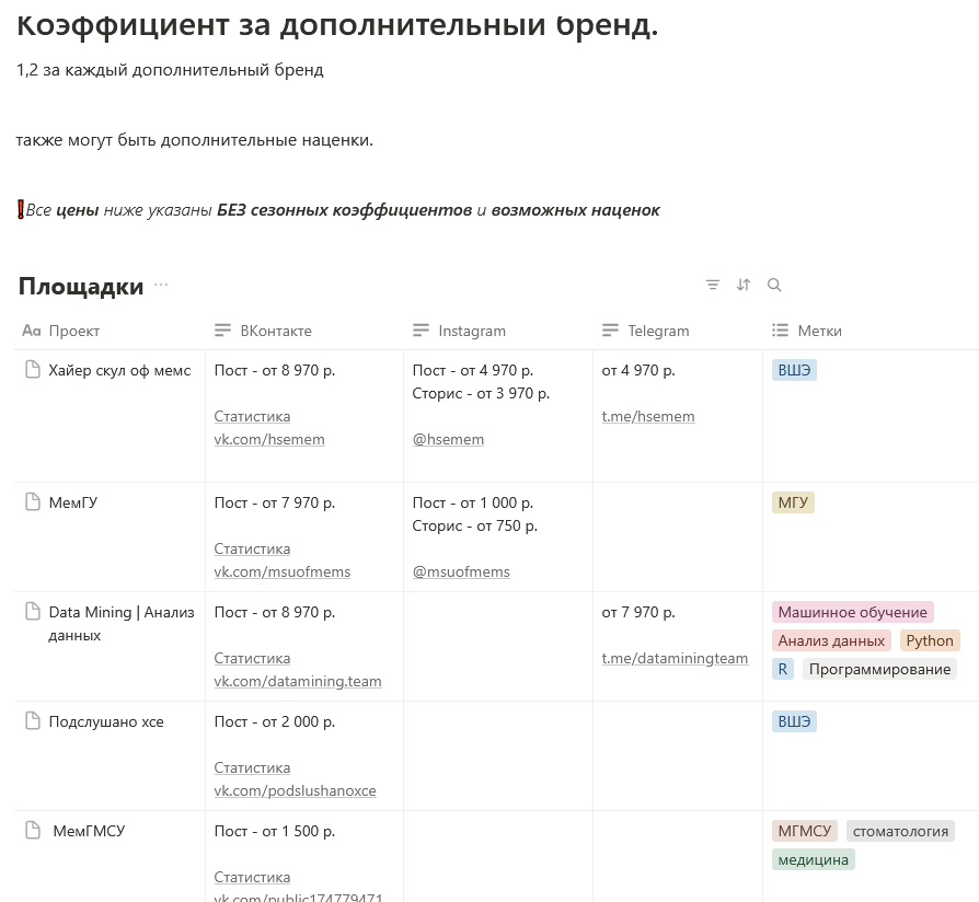 - Хайер Скул оф мемс – от 4970 рублей на ТГ и до 8970 за пост в ВК;