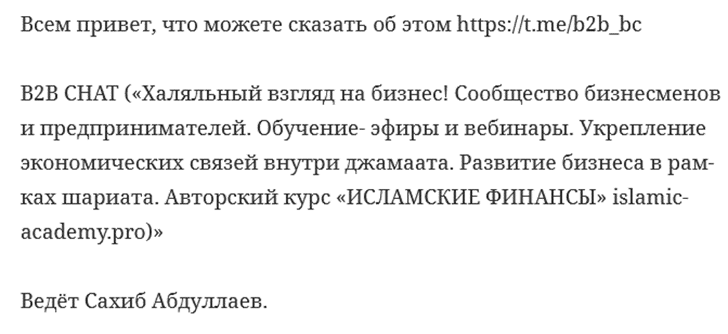 При поиске информации об авторе канала удалось найти сведения о его связи с другими проектами. Одним из них является B2B CHAT, который заявлен, как сообщество предпринимателей. Тут проводят эфиры и вебинары, вероятнее всего платные. Также этот автор указан в качестве лектора islamic academy pro, где он ведет курс Исламские финансы. У обоих проектов неоднозначная репутация, популярностью они не пользуются, независимых отзывов почти нет.