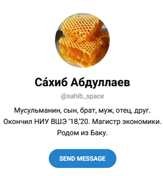 Автором канала заявлен Сахиб Абдуллаев. О нем практически ничего не известно. О себе он говорит, как о правоверном мусульманине родом из Баку. Заявляет, что окончил НИУ ВШЭ, является магистром экономики. Но никаких подтверждений или дополнительной информации о квалификации не дает. По всем вопросам предлагает писать в Телеграм sahib space.