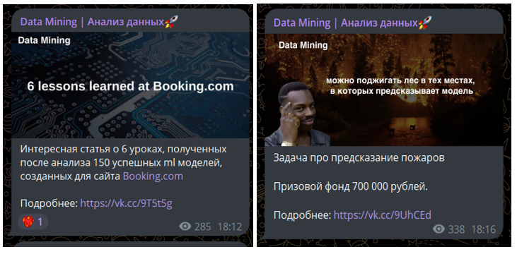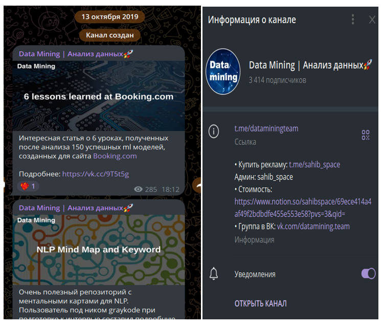 - Datamining Team – 8970 рублей за пост в группе ВКонтакте и от 7970 рублей за пост на канале Телеграмм Data Mining;