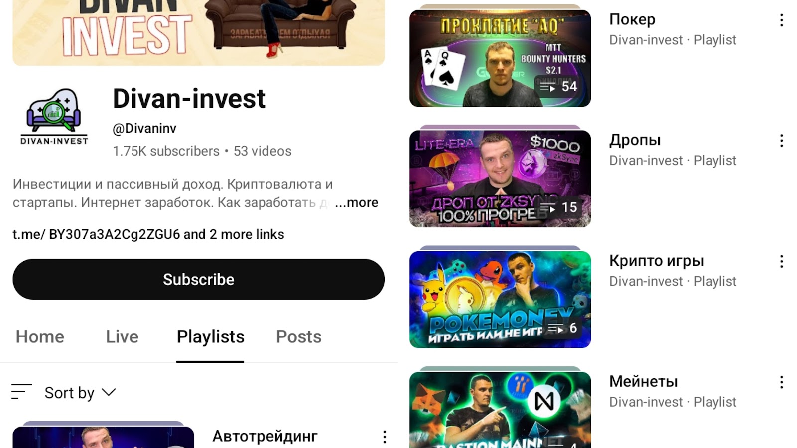 Ютуб канал Divan Invest начал функционировать с 2016 года, и на сегодняшний день здесь 1.75 тысяч подписчиков.За все время было опубликовано 53 видео, которые собраны в такие плейлисты, как: “Автотрейдинг”, “Стартапы”, “Покер”, “Дропы”, “Тестнеты” и прочие. Видеоролики в основном длятся 8-10 минут.