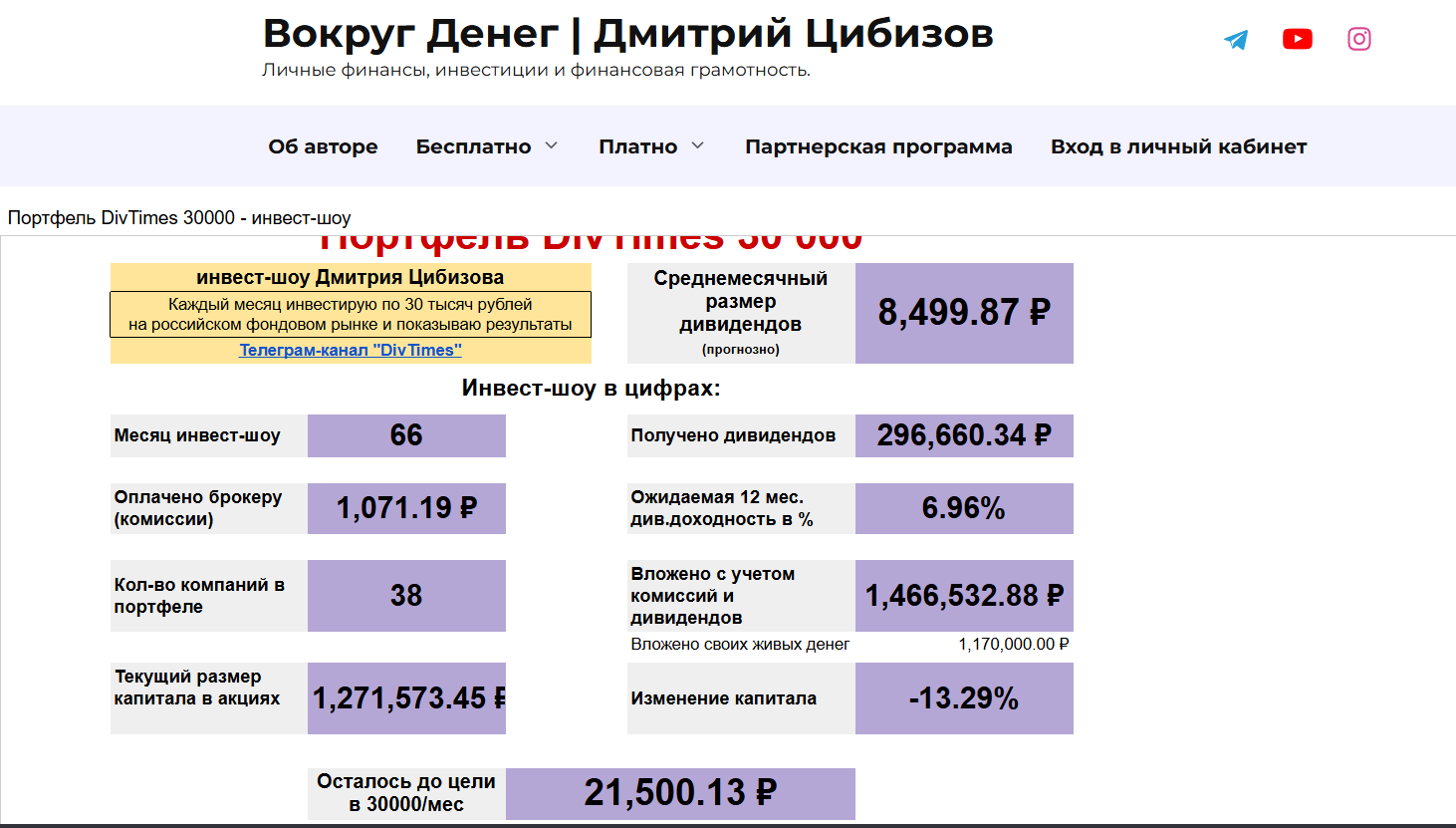 На сайте Fb VokrugDeneg com Дмитрий рассказывает, как прошел долгий путь, который позволил создать десятки источников пассивных доходов. В качестве доказательств инвестор предоставляет статистику за 66 месяцев, но она показывает недостаточную эффективность, так как роста практически нет.