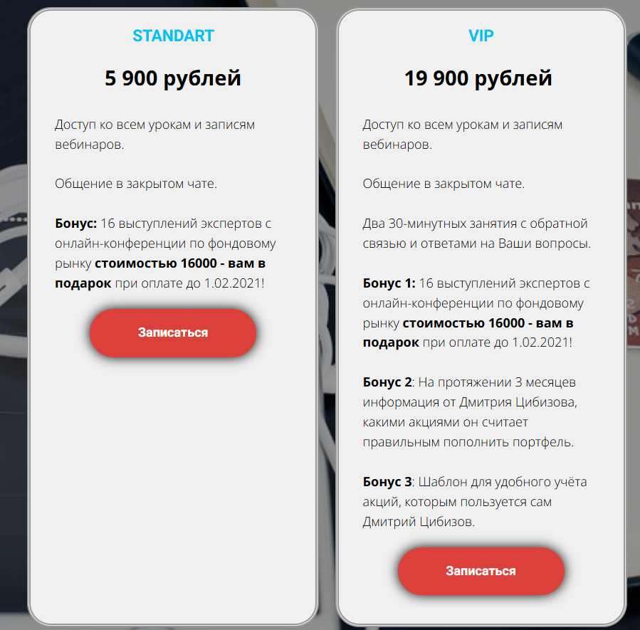 Автор предлагает два тарифа: Standart за ₽5,900 и Vip за ₽19,900, а отличаются они только предоставлением информации в течение трех месяцев об акциях, которые покупает Цибизов Дмитрий.