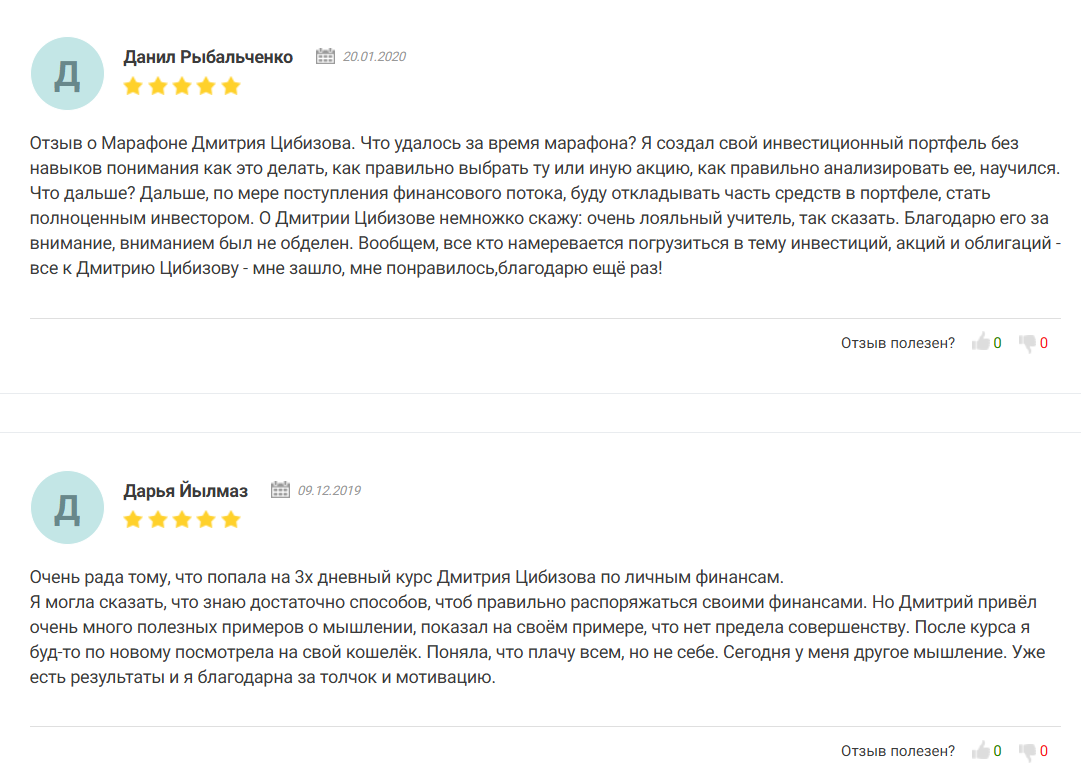 Большинство пользователей оставляют на разных сайтах положительные отзывы о Дмитирии Цибизове, в которых рассказывают, что научились анализировать акции и получили много полезной информации.
