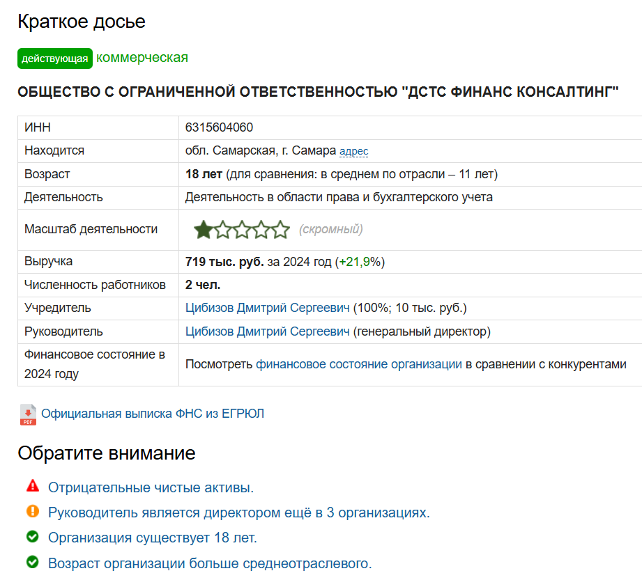 Цибизов Дмитрий Сергеевич зарегистрирован как ИП, что добавляет ему доверия, а также на аналитических сайтах указывают его компанию, которая работает с 2007 года. Проблема в том, что чистые активы организации отрицательные, то есть, долгов у нее в 13 раз больше, чем всего имущества.