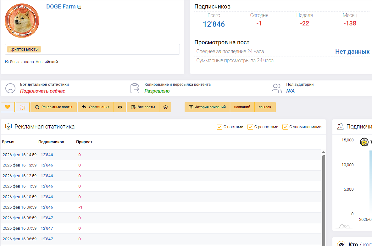 О чем же тогда паблик Doge Farm? Выяснить это не удалось: в сообществе нет ни одного поста. Сейчас там 12,8 тысяч сабскрайберов, при этом – ни одной публикации.Можно лишь видеть, что канал появился в 2023 году, а что там происходило с тех пор – неизвестно. В TGSTat этого сообщества нет, в некоторых других сервисах анализа есть, но толку от этого немного: