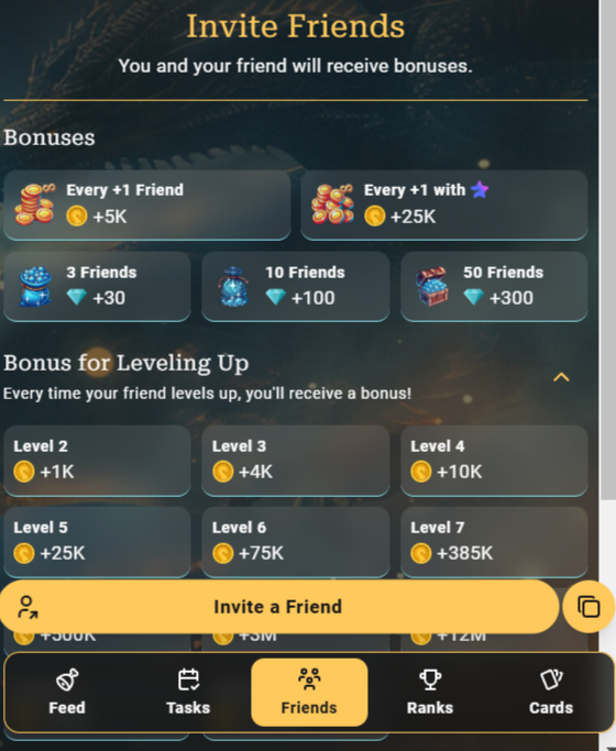 - Friends. В игре Dragonz Land действует партнерская программа, предусматривающая получение бонусов за привлечение друзей. Она имеет много уровней, с увеличением которых повышается размер вознаграждения. За каждого друга начисляется 5000 монет. Если он имеет премиальный аккаунт, размер выплат увеличивается до 25 000. Кроме того, за привлечение 3, 10 или 50 друзей предоставляется 30, 100 или 300 монет соответственно.