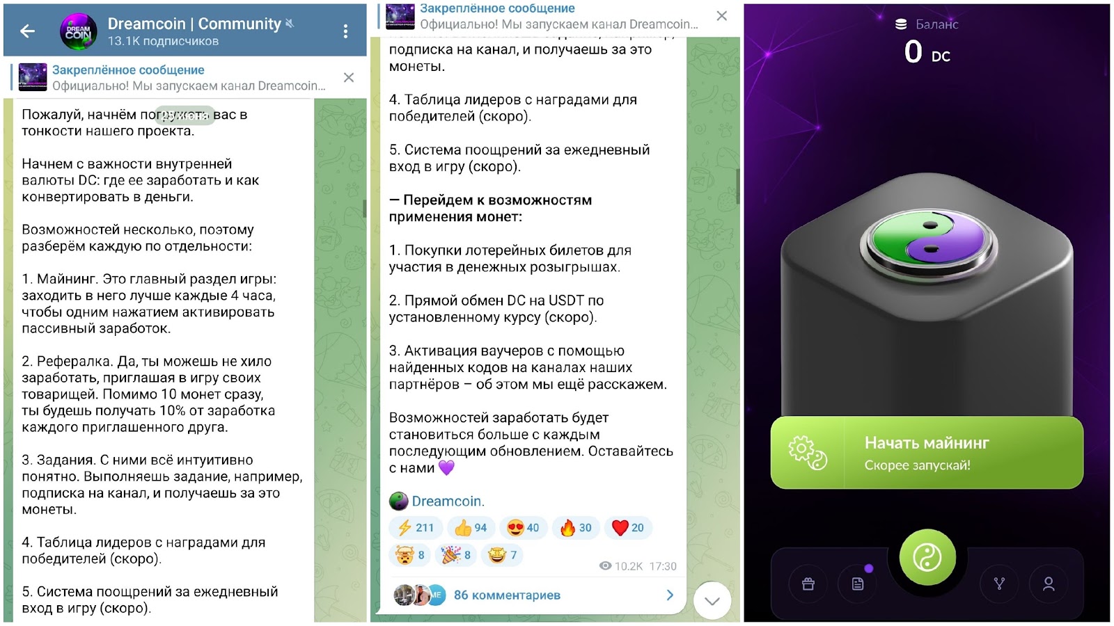 ТГ-канал “Dreamcoin” создан 2 месяца назад и имеет 13 тысяч подписчиков. В первом сообщении разработчики Олег Габоев (@ Gaboev) и Влад (@ Vlad M20) сразу рассказывают принцип и правила майнера. Цель игры заключается в накапливании момент, благодаря которым можно будет участвовать в розыгрышах, обменивать их на реальные деньги и приобретать необходимые предметы в магазине приложения. Также, для получения большего количества различных бонусов, тут предлагают приглашать друзей в игру, решать задания, находить спрятанные на канале коды для активации ваучеров. Выполняя эти действия, есть вероятность попасть в ежемесячный топ по майнингу, но что за это полагается — неизвестно.