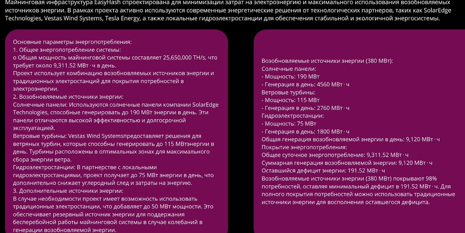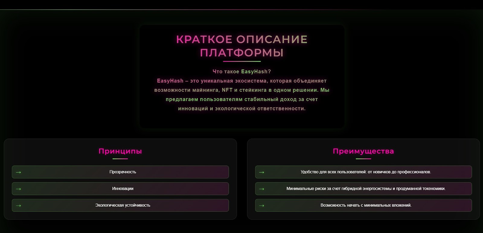 Easy Hash Mining специализируется на облачном майнинге, основанном на технологиях блокчейна и NFT. Чтобы начать зарабатывать, пользователь выкупает NFT-майнеры, которые представляют собой доли вычислительных мощностей в дата-центрах компании. Проанализировав веб-ресурс Easy Hash Miningmining com, можно сделать вывод, что это эко-проект, который задействует возобновляемые источники энергии. На сайте присутствуют данные о местонахождении дата-центров, их рабочих мощностях и ежедневных объемах добычи криптовалют.