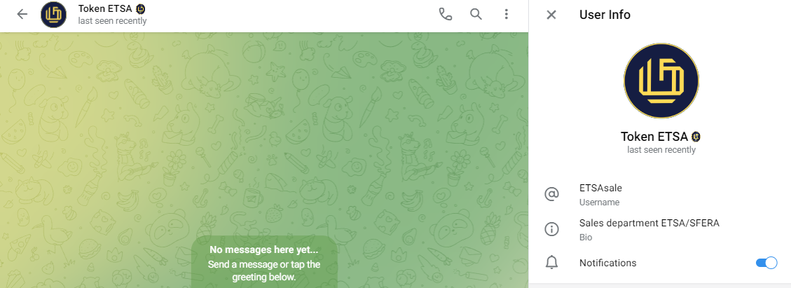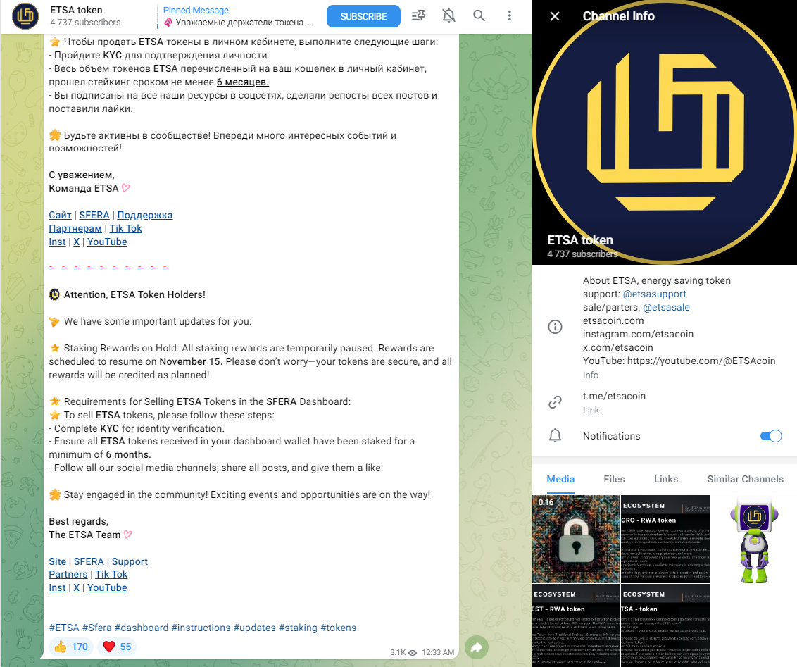Посты публикуются крайне редко, около одного в месяц, где указывается новостная информация о технических действиях с токеном ETSA. Также есть телеграм аккаунт Etsasale, через который вы можете приобрести данный актив.