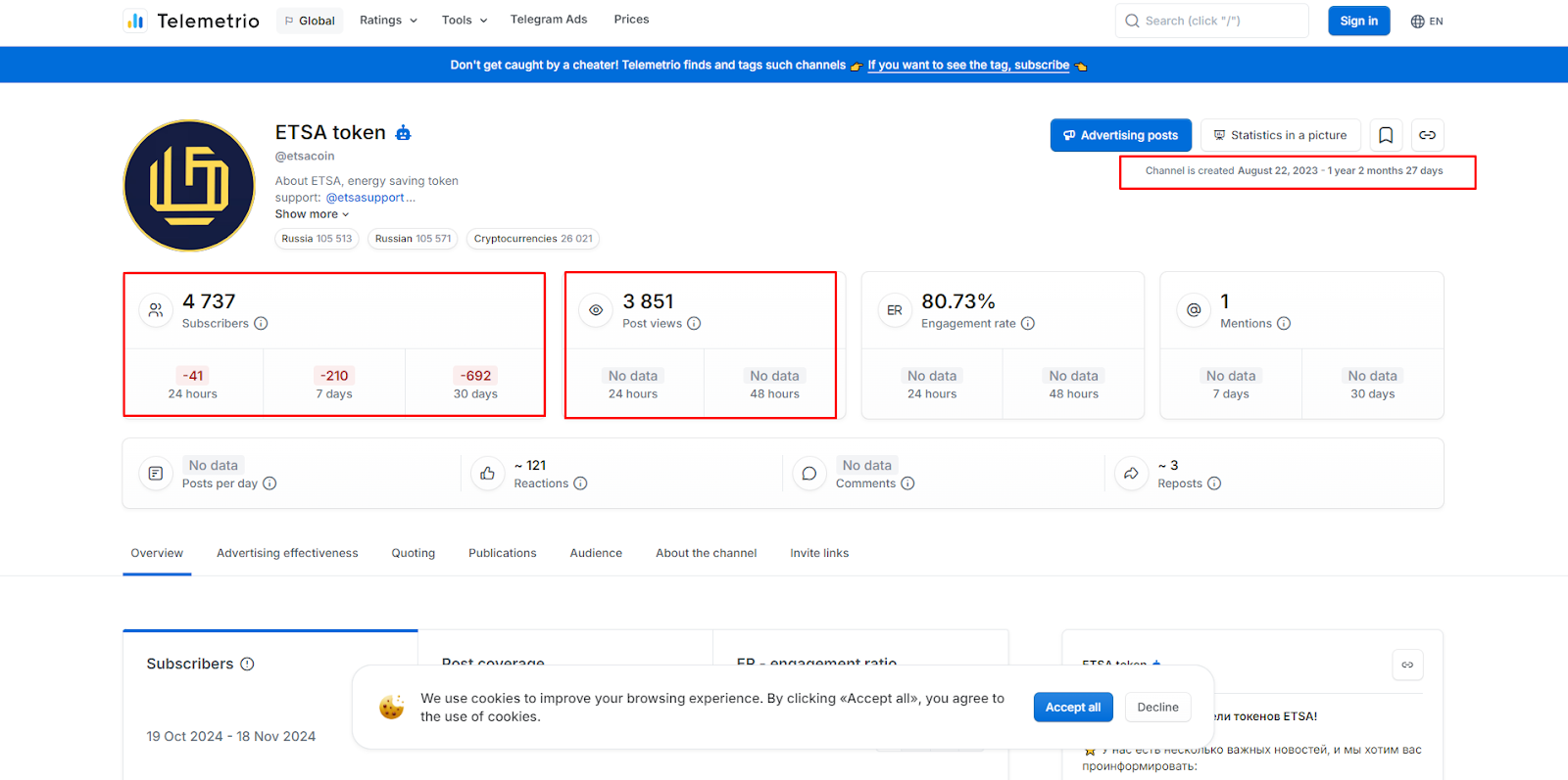 ТГК etsacoin был зарегистрирован в августе 2023 года, за все время набрал аудиторию в 5-6 тысяч, однако ежемесячно до 700-800 человек отписываются. При этом среднее количество просмотров составляет около 3 тысяч.