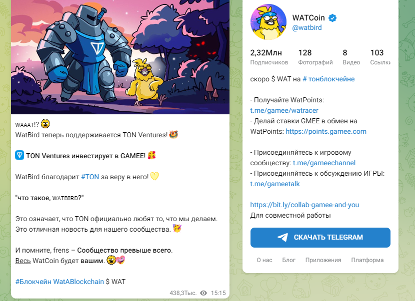 Например, одним из самых громких проектов стал WATcoin с яркой желтой птичкой на аватарке. Причем он смог стать настолько громким, что количество игроков в нем уже успело превысить несколько миллионов. В частности, лаунч игрового токена $ WAT состоится уже 23 сентября, согласно заявлениям от разработчиков.