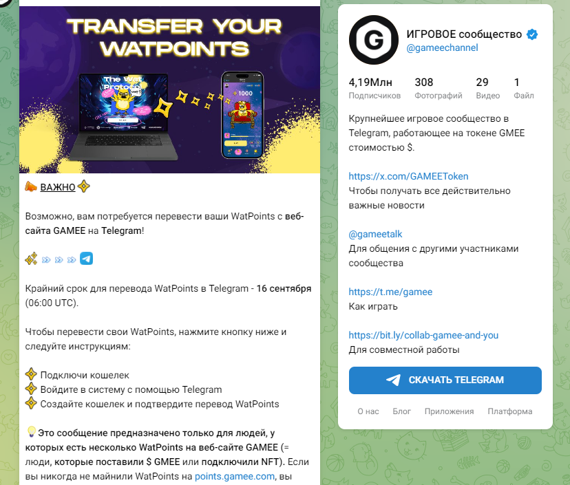 В Телеграм gamee контент выходит активно и регулярно. Например, недавно пользователей предупредили, что какой-то неизвестной причине те игроки, которые тапали в WATcoin, должны перенести все заработанное на платформу, иначе их $ WAT сгорят. С какой именно целью это надо сделать 一 неизвестно.
