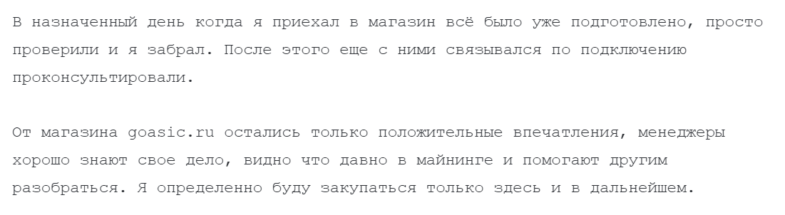 Мы провели анализ площадки по продаже оборудования для майнинга, рассмотрели отзывы о Goasic ru, услуги компании и прочие факторы. Организация действительно продает асики и прочую технику. Она выдает гарантии на оборудование и отправляет все в разные города страны. Также тут можно воспользоваться услугами размещения техники в майнинг-отеле. В комментариях люди не пишут, что Goasic – обман, а оставляют только положительные отзывы.