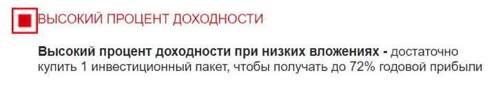 Заявлено, что компания готова платить до 72% годовых. По данным из открытых источников подобные инвестиции в среднем приносят на порядок меньше. Такие обещания вызывают серьезные сомнения. Для чего компании давать вкладчикам такие проценты, если она вполне может взять эти деньги у банка под гораздо меньший процент?
