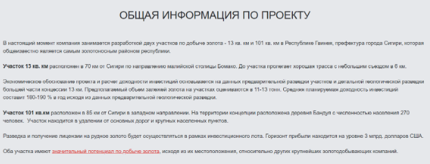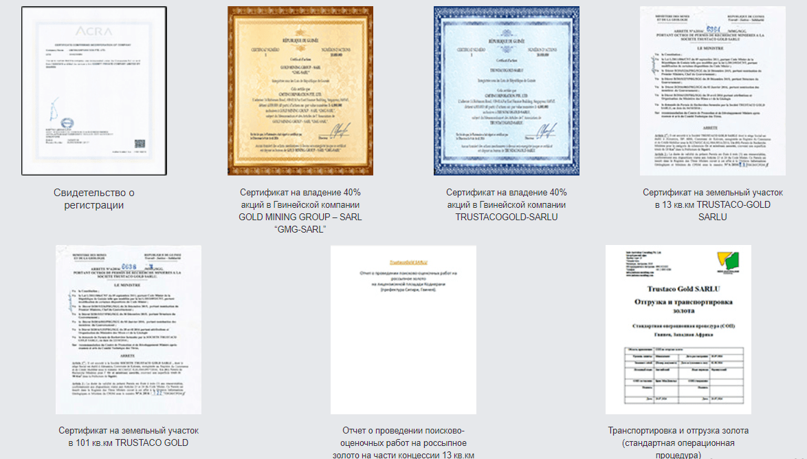 Представлена информация о том, где именно проводится добыча. Но никакого подтверждения этой информации не предоставляется.На сайте опубликованы сертификаты и документы, однако, проверить их подлинность не представляется возможным. Кроме того, в рамках СНГ вряд ли хоть один из этих документов имеет юридическую силу.