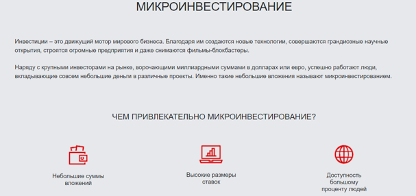 Компания привлекает вкладчиков возможностью инвестировать небольшие суммы, а также высокими ставками.
