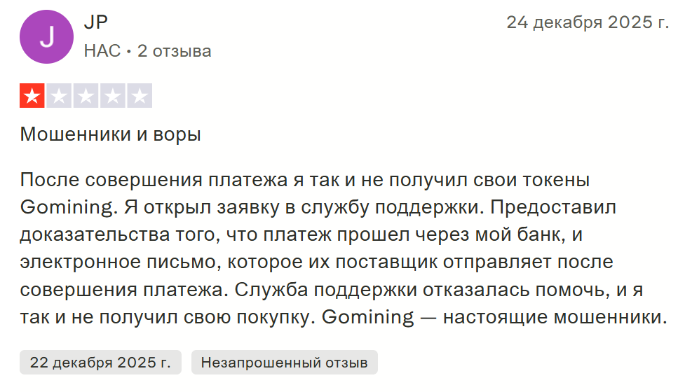 Несмотря на относительно высокий рейтинг, встречаются и негативные комментарии. Авторы отрицательных отзывов называют GoMining Digital Miners обманом и жалуются на низкую доходность. Вместо обещанных 30–40% годовых ряд инвесторов получили прибыль в 5–7% за 12 месяцев.