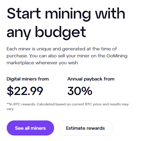 GoMining — это онлайн-платформа для майнинга. На ней пользователи могут зарабатывать биткоины в качестве вознаграждения за использование виртуальных майнеров, стоимость которых стартует от 23 долларов. Доходность обещают в 30–40% годовых, что довольно много и звучит сомнительно.