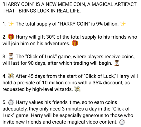 Проект Harry Coin был создан в августе 2024 года. Вместе с ним запустились и продажи мемкоина HARRY. Токен работает в блокчейне TON и является главной валютой тапалки Harry Coin | Click of Luck.