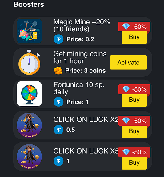 • Boosts. Здесь пользователи могут приобрести дополнительные усиления. Среди них х2 и х5 бонусы за клик, дополнительные вращения колеса фортуны, повышенная доходность майнинга и прочие.