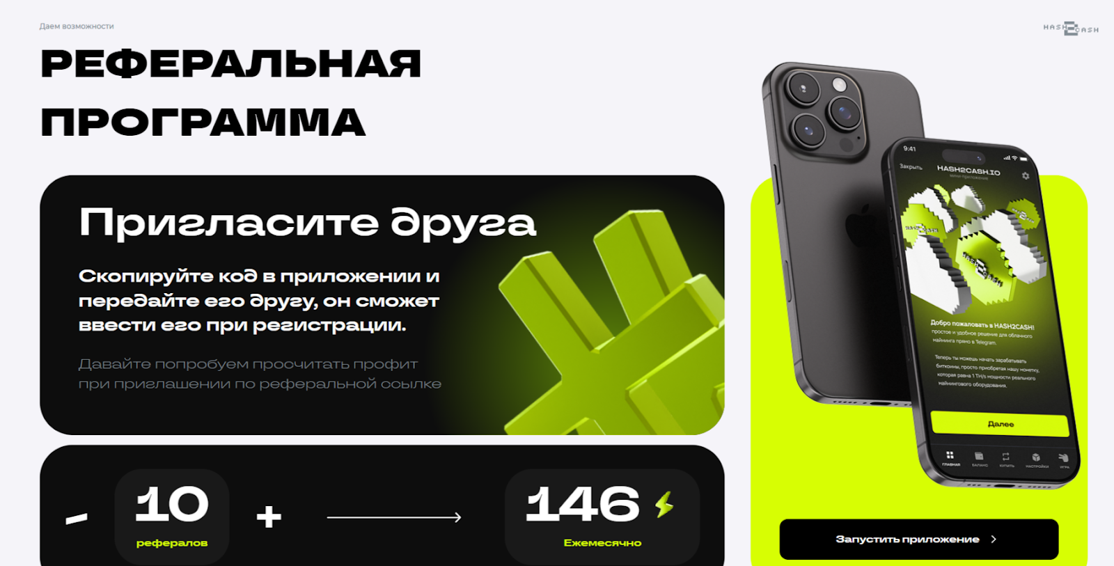 Более подробно платформа для майнинга Hash to Cash рассказывает о реферальной программе. В ее рамках клиенты проекта могут ежемесячно получать 146% за привлечение 10 рефералов.