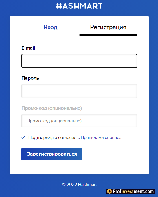 Регистрация на Hashmart.io совершенно стандартная – нужно заполнить форму, введя адрес электронной почты и придумав пароль. Если есть реферальный промокод, его тоже нужно вставить, это даст скидку 5%. При переходе по реферальной ссылке код применяется автоматически.