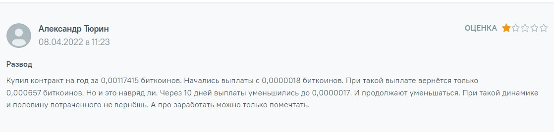 Отзывы сайт Hashmart io и сам проект собрал не очень положительные.Пользователь пишет про то, что покупал на платформе контракт, но в итоге выплаты сильно уменьшились и теперь он рассчитывает лишь на менее половины вложенных средств.