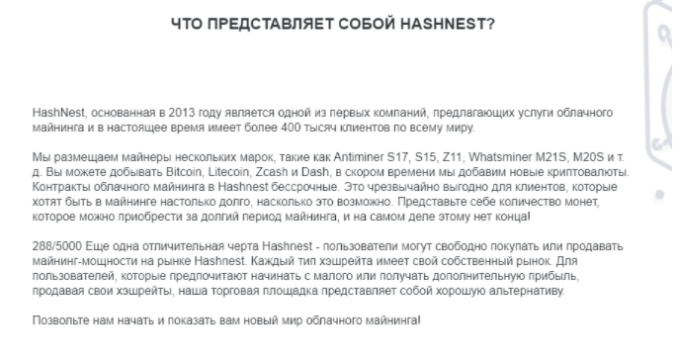 HASHNEST — это платформа, которая предлагает облачный майнинг биткоина. Компания заявляет о больших мощностях и тысячах клиентов.