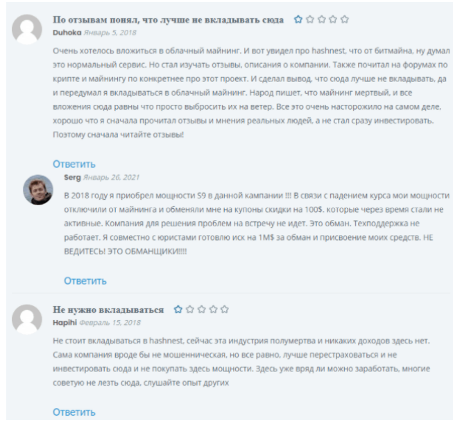 Отзывы о HASHNEST в основном негативные. Причины:
