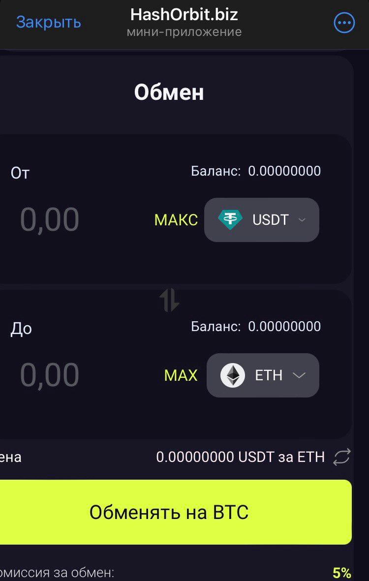 На проекте предусмотрен майнинг в автоматическом режиме через чат-бота в Телеграм – Hashorbitbot. После его запуска пользователь открывает мини-приложение.