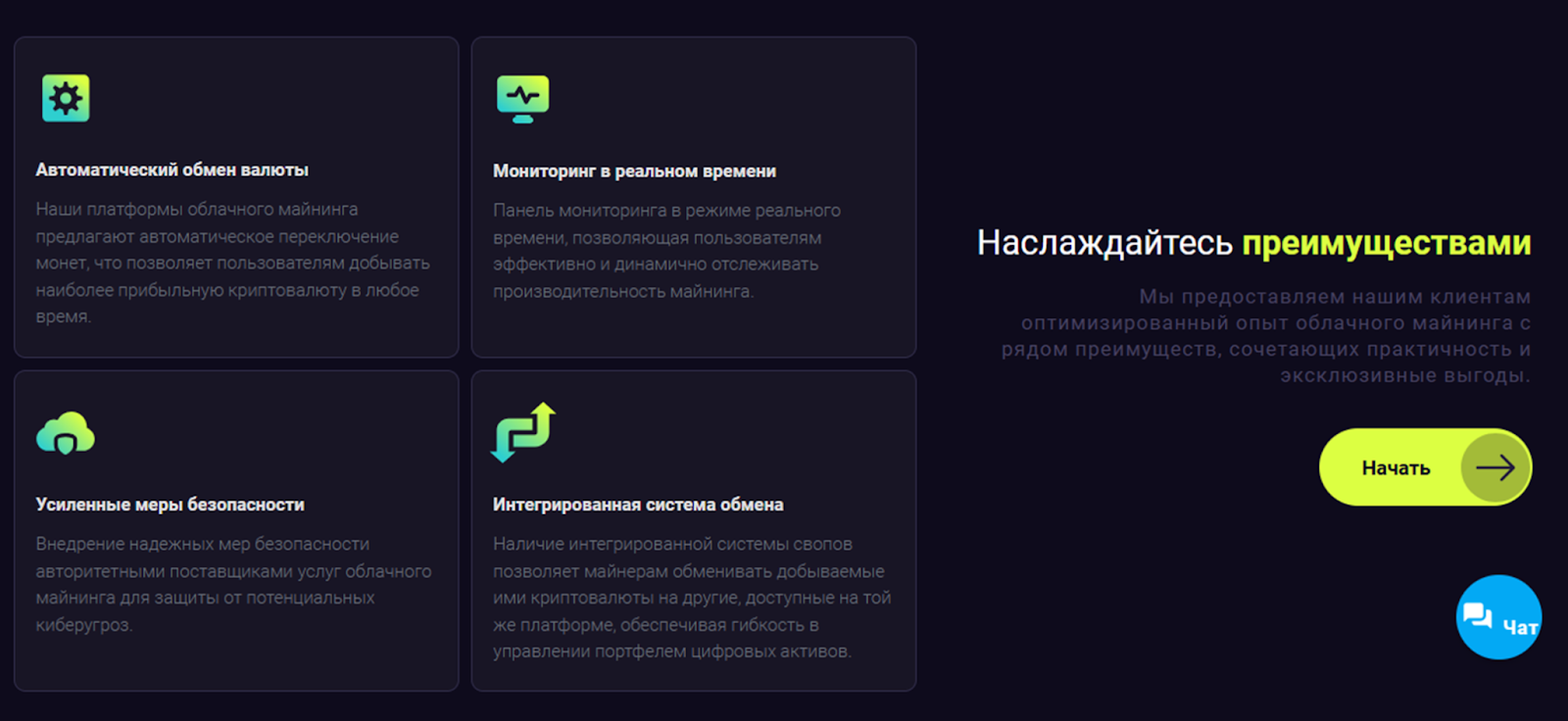 Хотя преимущества платформы расписаны весьма ярко, но данных о регистрации проекта, команде разработчиков нет. Никаких официальных документов клиентам не предоставлено, что повышает риск потери денег в разы. Не сказано даже где именно размещаются вычислительные мощности и каковы реальные гарантии получения прибыли.