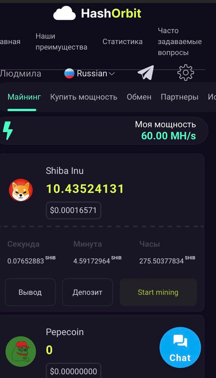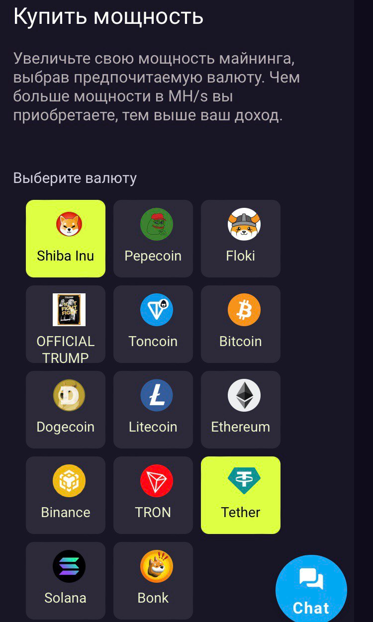 На главном экране перед пользователем появляется перечень монет для добычи. Всего в списке 14 токенов, среди них Биткоин, Эфир, TON, Trump, Shiba, Pepe, Floki, Tron и ряд других не менее известных наименований. Бесплатно можно запустить майнинг только одной монеты из списка. Для увеличения скорости и количества добываемых токенов необходимо пополнить баланс и купить мощность. Автоматически участник получает мощность в 60 МН/ s.