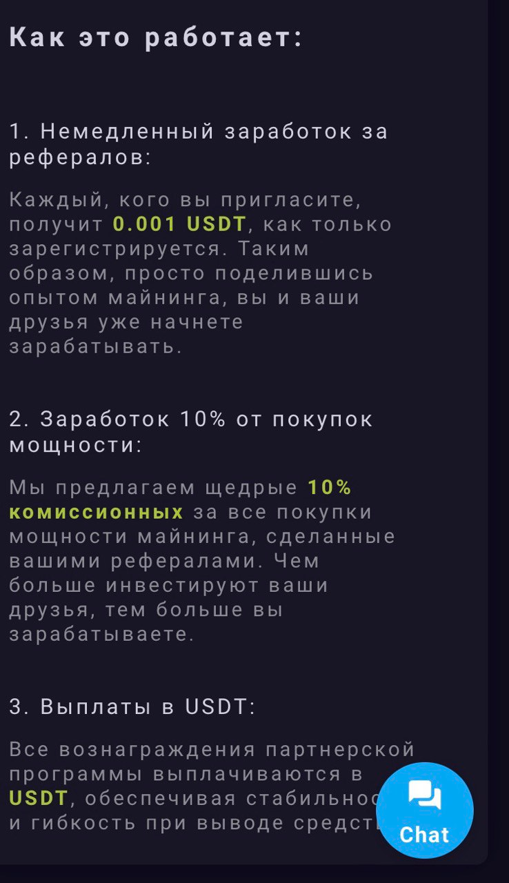 Предусмотрена и реферальная программа, в рамках которой все приглашенные друзья получают на счет 0,001 USDT. Участник программы получает 10% от покупок, совершенных друзьями. Выплаты осуществляются только в USDT.