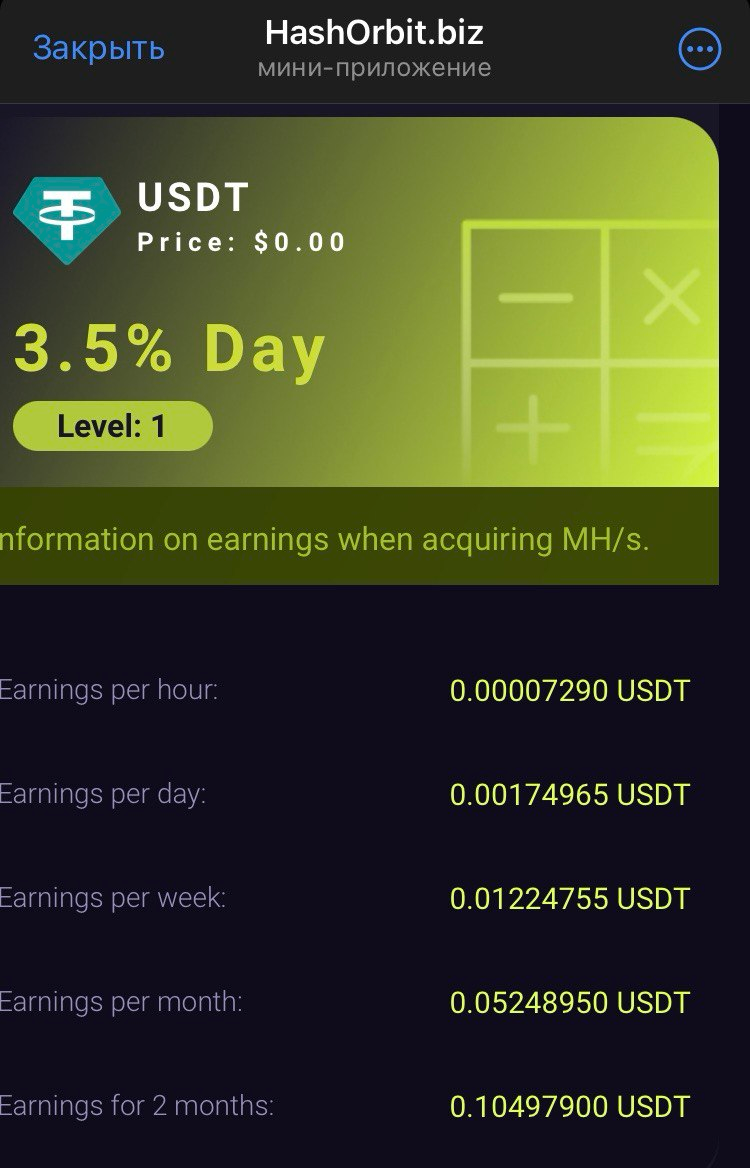 Купить мощность можно в соответствующем разделе приложения. Логично, что чем больше внесенный депозит, тем выше уровень дохода. Заявлена минимальная доходность от 3,5% в день.