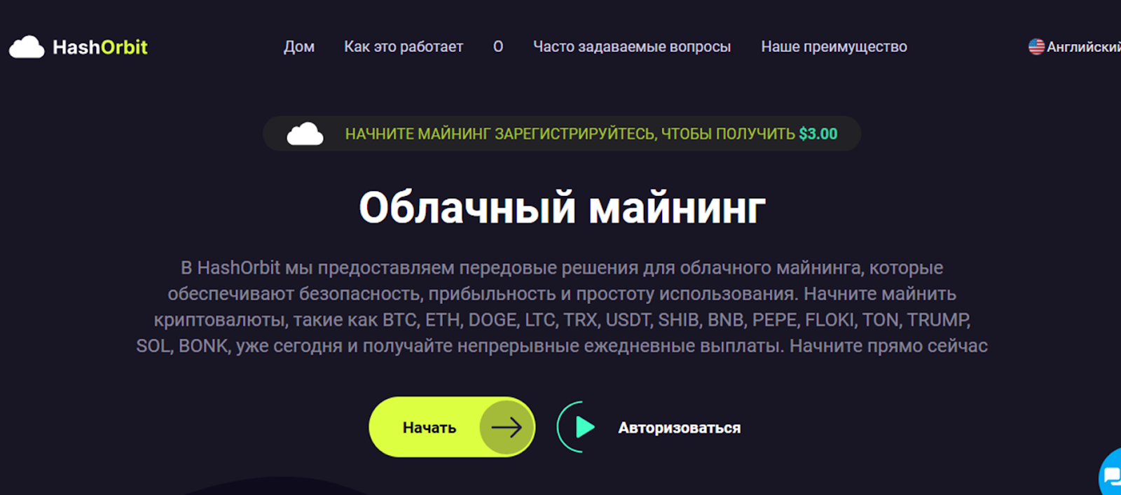 Hashorbit biz предлагает возможность зарабатывать на облачном майнинге и получать ежедневные выплаты. В списке самые популярные и волатильные монеты. Это, например, Биткоин, Эфир, Шиба, USDT, TON, TRUMP и ряд других токенов с высокой волатильностью.