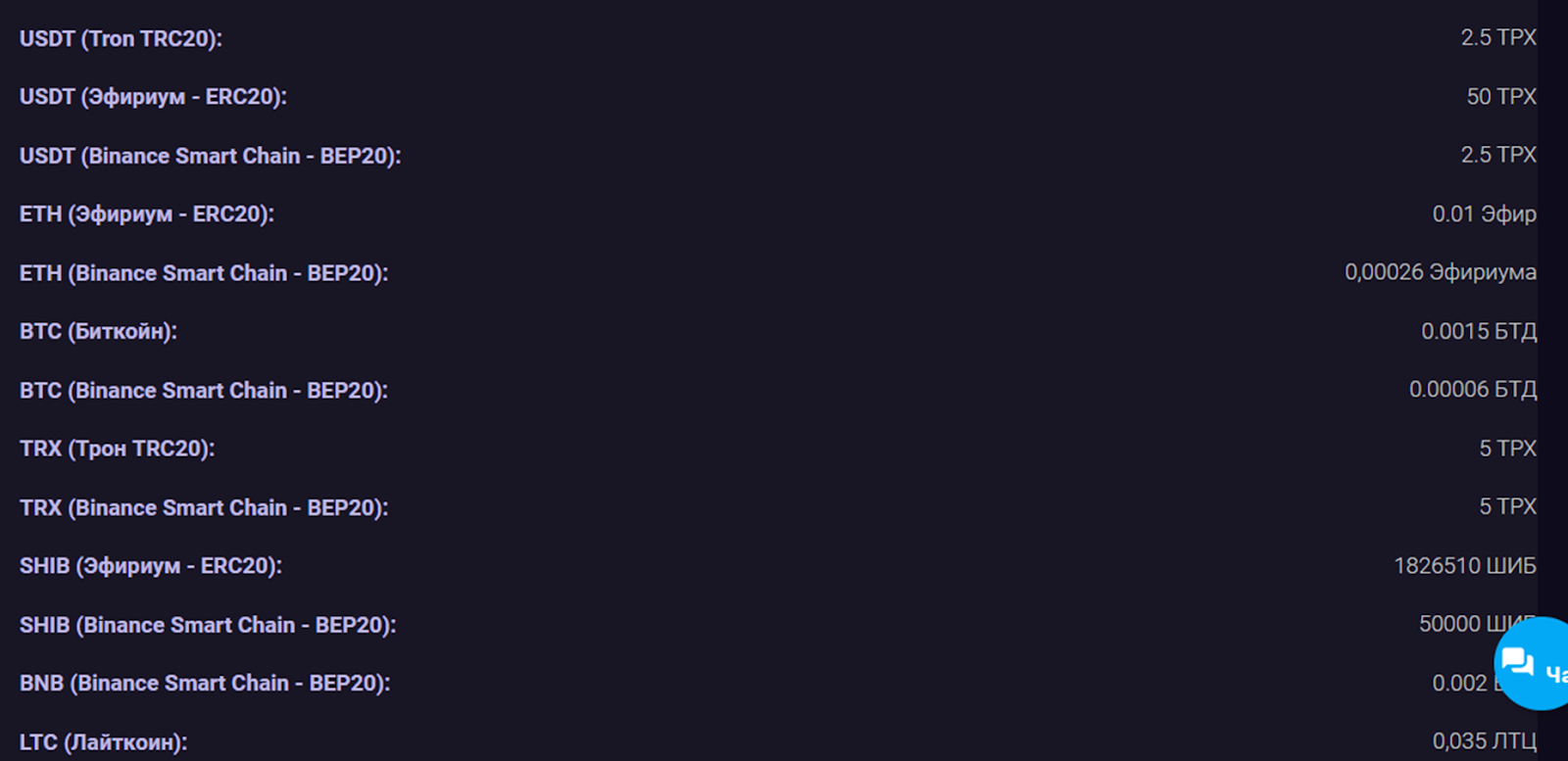 Вывод прибыли осуществляется в любой криптовалюте, которая доступна для майнинга на платформе. Таблица с минимальными суммами представлена на скриншоте ниже.