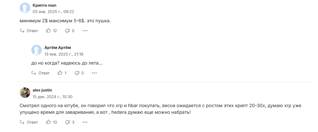Мнения пользователей относительно того, какие перспективы на будущее есть у Hbar, расходятся. Одни считают, что в 2025 году будет реализован совместный проект XRP и HBAR — стейбл RLUSD, который будет интегрирован в Федеральный резерв США. Пока эта информация не имеет подтверждений в официальных источниках и остается слухами. Но оптимисты ждут стоимость Хбар в 20-30 раз выше текущих отметок. Пессимисты думают, что роста у токена уже не будет. Аналитика, основанная на техническом разборе графика, допускает рост даже до полутора долларов, но это не 30 иксов, хотя тоже немало. Сколько в реальности будет стоить монета, покажет время.