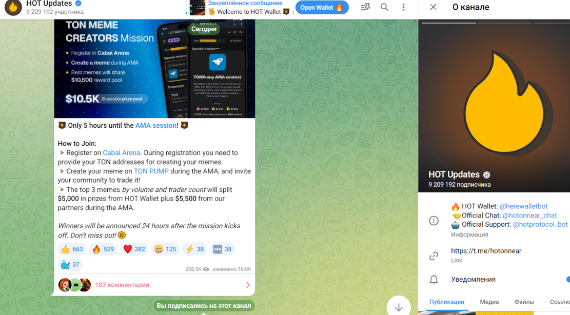 Узнать о монете и боте можно с помощью Тг канала HOT Updates. На него подписано более 9 млн пользователей.