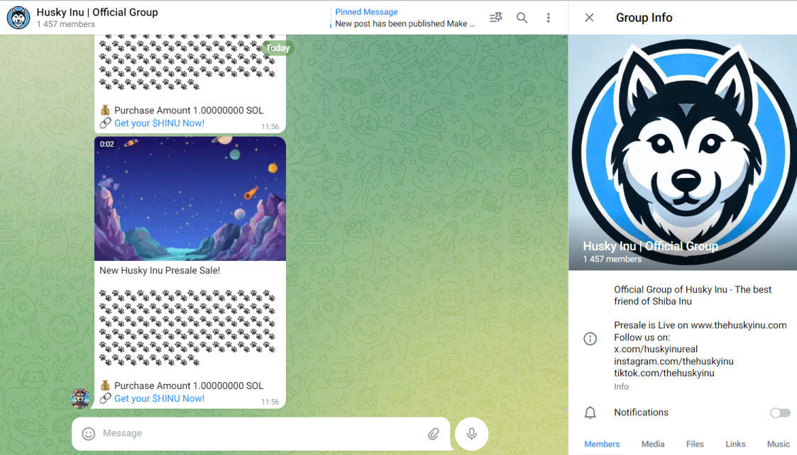 Узнать особенности проекта можно в Телеграмме Husky Inu OFFICIAL CHANNEL. У него 1.4 тыс. участников.Здесь админы уведомляют о предварительной продаже token Husky Inu. Также оставляют ссылку на документ с информацией о целях и планах на проект.