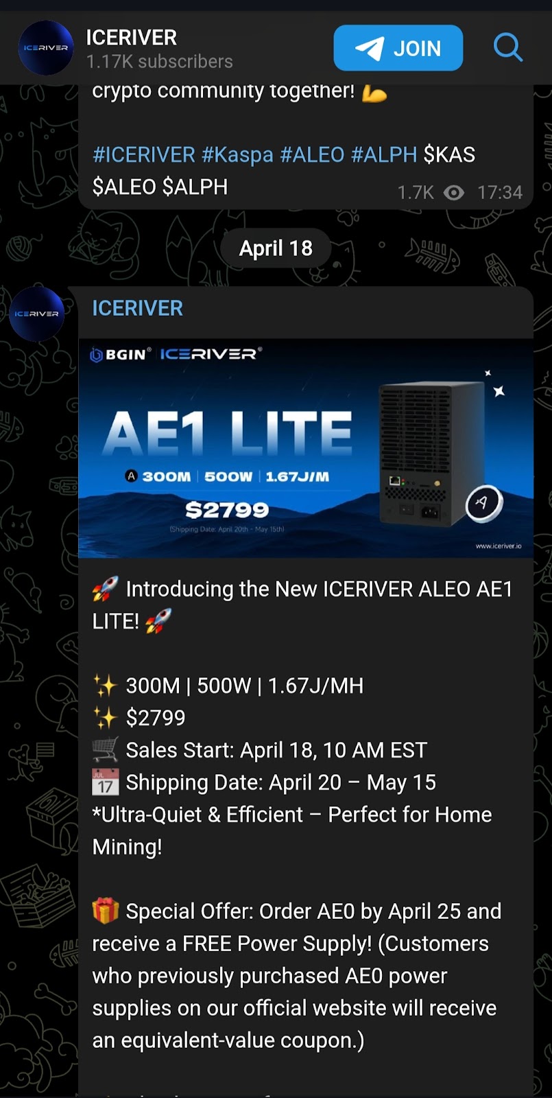 Стоимость начинается от $500 за базовую модель и до $1,000 — за мощную KS3M, что по сути немного, ведь майнеры для Bitcoin стоят от $2,000. Правда есть нюанс: оборудование нельзя перенастроить на другие криптовалюты. Информации об основателях компании не удалось найти в открытом доступе. Релизы обновлений или важные новости о проекте публикуются в телеграмм-канале IceRiverOfficial.