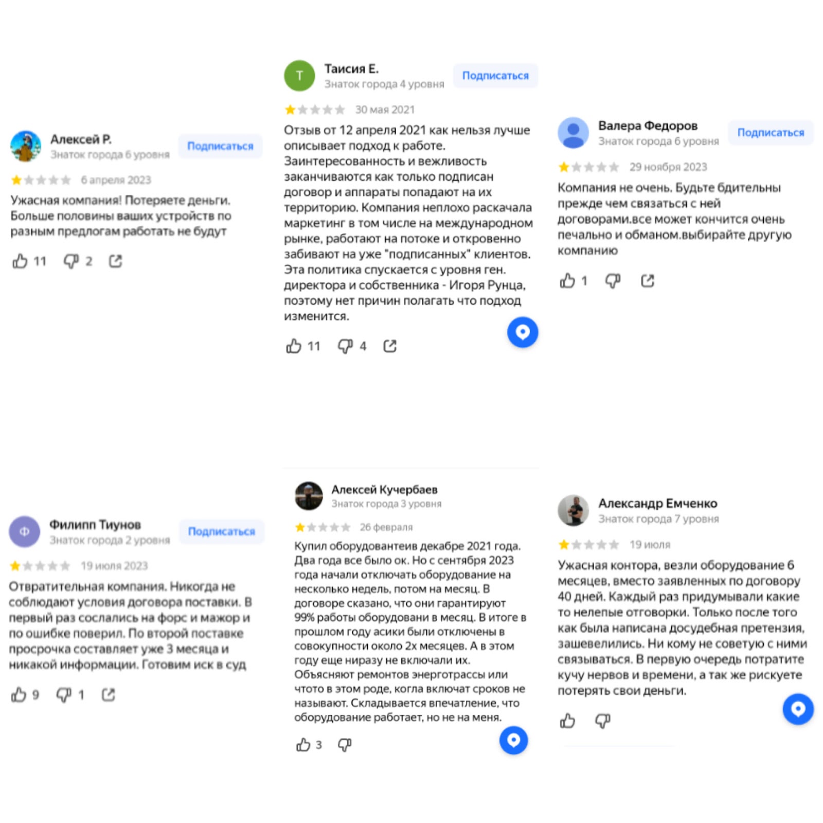 В негативных отзывах клиенты рассказывают, что Игорь Рунец руководит сомнительной компанией, которая некачественно обслуживает клиентов. Оборудования могут отключать на несколько месяцев, ссылаясь на ремонтные работы.