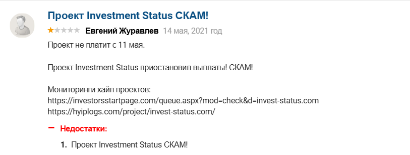 На независимых сайтах об инвестиционном проекте отзывы противоречивые. Некоторые пользователи пишут, что компания Инвест Статус надежная и честная, всегда выплачивает деньги и не требует больших вложений.