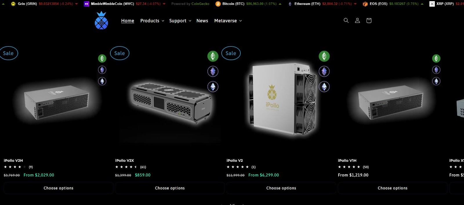 Всемирная известность настигла «Айполло» в 2022 году, когда компания анонсировала флагман iPollo V1. Данный аппарат по своим характеристикам почти не уступал топовым моделям Bitmain. Позже последовали серии X, V2, G и B. В 2023 году фирма выпустила первый майнер для добычи ASIC-устойчивой криптовалюты Grin – не менее значимое событие для iPollo.