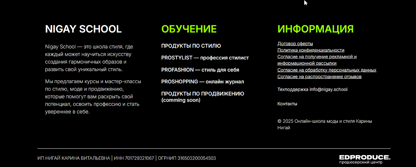 Сайт онлайн-школы Nigay Karina был зарегистрирован в 2020 году, но последние изменения на нём датированы 2025 годом. В футере опубликованы сведения по ИП, ИНН и ОГРНИП, но лицензии на ведение образовательной деятельности нет.